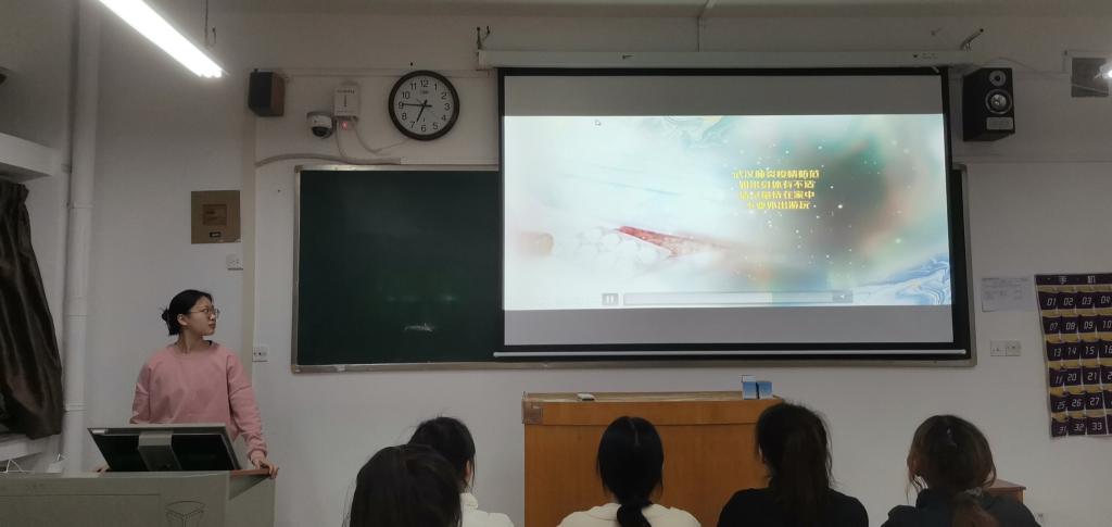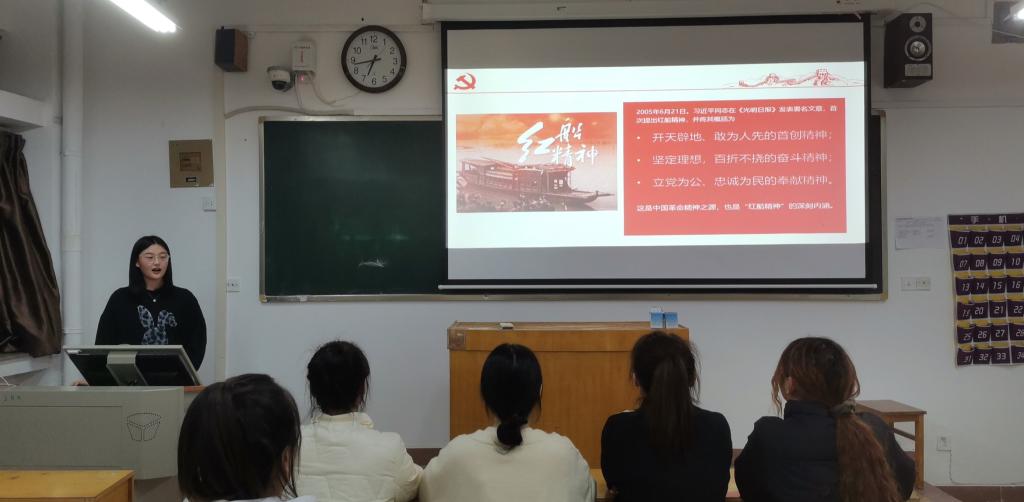 王迎男以《以塞罕坝生态发展历程解读十九届六中全会生态文明建设成就》为题,讲述塞罕坝“荒原变绿洲”的人间奇迹,她结合习近平生态文明思想,呼吁在场同学要牢固树立绿水青山就是金山银山理念;李文艳以红船精神的为题,全面展示百年大党披荆斩棘、一往无前的红船征程;杜晓洋讲述各行各业的共产党员们不畏疫情,逆行而上,用初心践行使命,用实际行动践行入党誓词。宣讲结束后,在场同学们纷纷表示塞罕坝精神、红船精神与抗疫精神均从不同方面展示了百年大党所坚守的初心使命,应当深入学习,从精神中汲取力量,坚定理想信念。