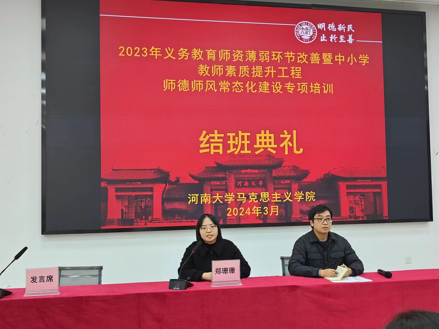 3月8日上午,河南省2023年义务教育团队薄弱环节改善暨中小学教师素质提升工程:师德师风常态化建设专项培训班一班结业典礼在必赢242net官网明伦校区科技馆一楼报告厅隆重举行,公司党委副书记郑珊珊参加了结班典礼,结班典礼由班主任张欢主持。