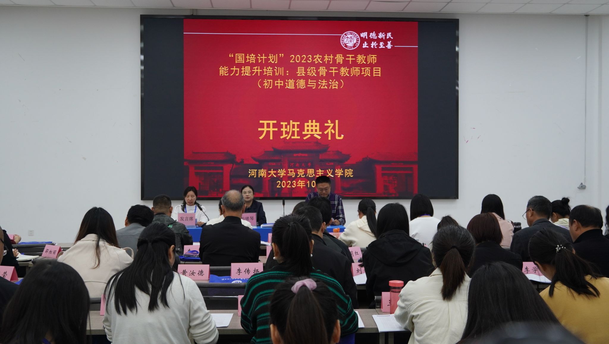 10月11日上午,河南⼤学“国培计划”(2023)农村骨干教师能力提升培训:县级骨干教师项目(初中道德与法治)开班典礼在必赢242net官网明伦校区科技馆⼀楼报告厅举行。公司党委书记彭绪琴、副经理孟骞参加了开班仪式,开班仪式由孟骞主持。