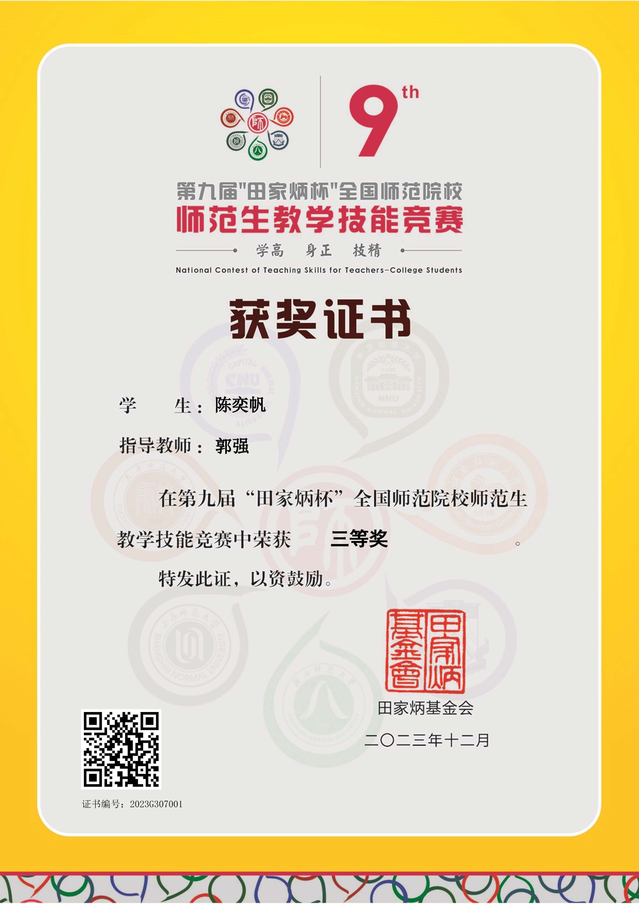 第九届“田家炳杯”全国师范院校师范生教学技能竞赛已于日前圆满落下帷幕,必赢242net2020级本科生陈奕帆荣获全国三等奖。