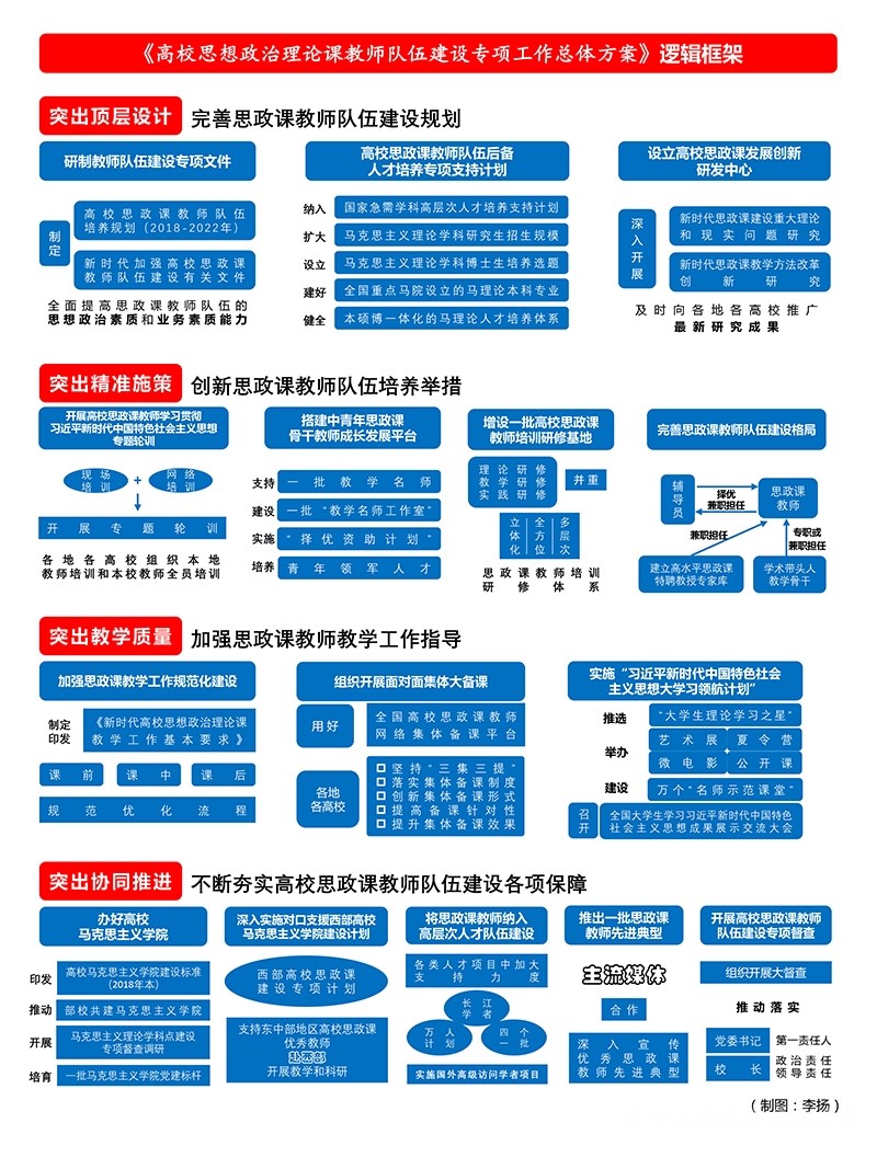 为全面推动习近平新时代中国特色社会主义思想进教材进课堂进员工头脑,聚焦提升思政课教师综合素质和专业化水平,继续打好提高高校思政课质量和水平的攻坚战,培养担当民族复兴大任的时代新人,教育部决定2018年实施高校思想政治理论课教师队伍建设专项工作,并于日前印发了工作总体方案。