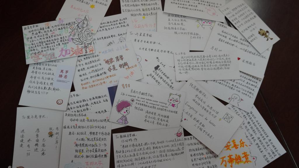 “考研充电宝”中每一份礼物都有其暖心的寓意,牛奶代表着信心十足,“牛”气冲天;旺仔代表着“旺”气十足,稳操胜券;橙子代表着胸有“成”竹,心想事“成”;文具代表着妙笔生花,金榜题名;暖贴代表着学院温暖的心意,里面还有一张张承载着学弟学妹们真挚祝福的手写卡片。收到学院送的“考研充电宝”后,同学们都激动地表示自己要更加全力以赴,积极备考,以最好的成绩回报学校和学院。