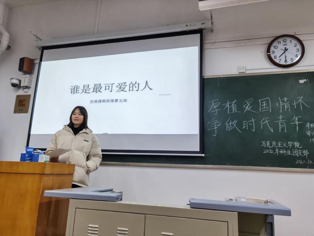 2001本科生团支部邀请学习小组成员介绍家乡革命传统,讲述英雄事迹,从一个个鲜活的事例中感悟英勇顽强、舍生忘死、不畏艰苦、慷慨奉献的抗美援朝精神。2002本科生团支部则由团支书为同学们讲解了抗美援朝战争的发展过程以及战争胜利的伟大意义。2003本科生团支部邀请了三位同学分享团日活动学习心得,他们都表示要弘扬抗美援朝精神,珍惜和平,做一名心怀国家的新青年。