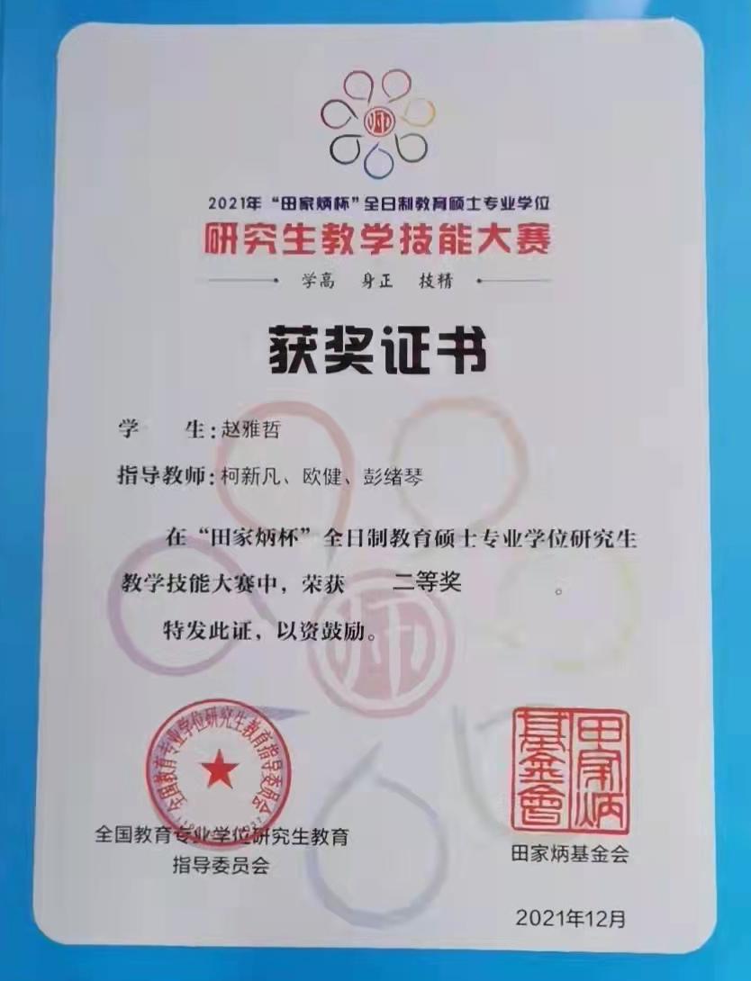 2022年1月7日,由全国教育专业学位研究生教育指导委员会主办、浙江师范大学承办的 “田家炳杯”全日制教育硕士专业学位研究生教学技能大赛通过线上举行。公司学科教学(思政)专业研究生赵雅哲众多选手中表现优异荣获二等奖,柯新凡、欧健、彭绪琴三位老师荣获优秀指导教师奖。