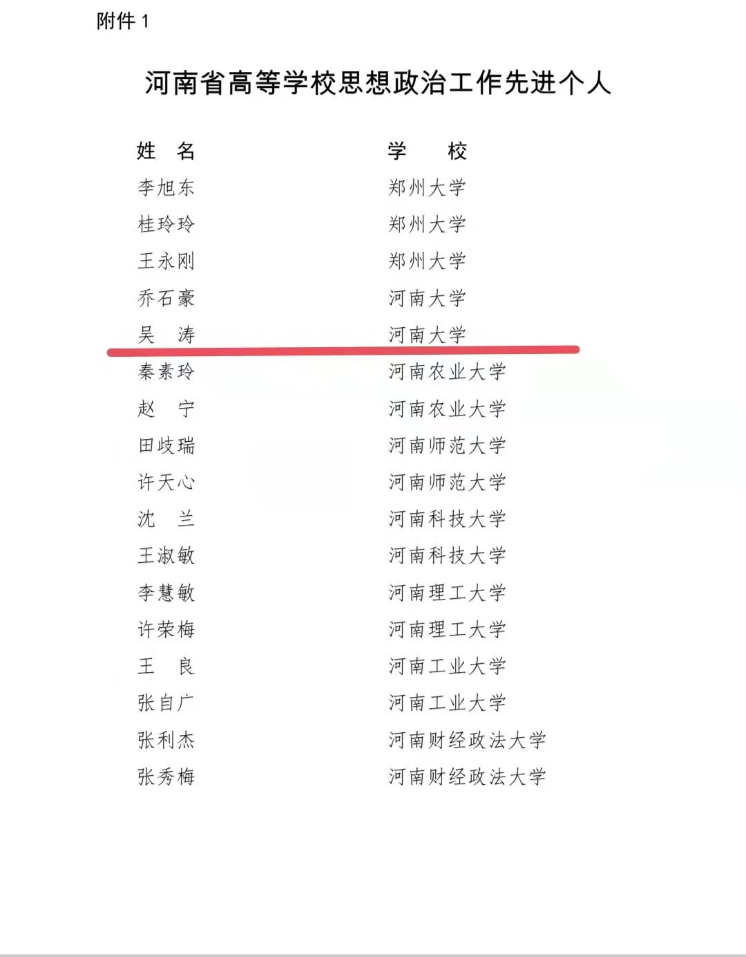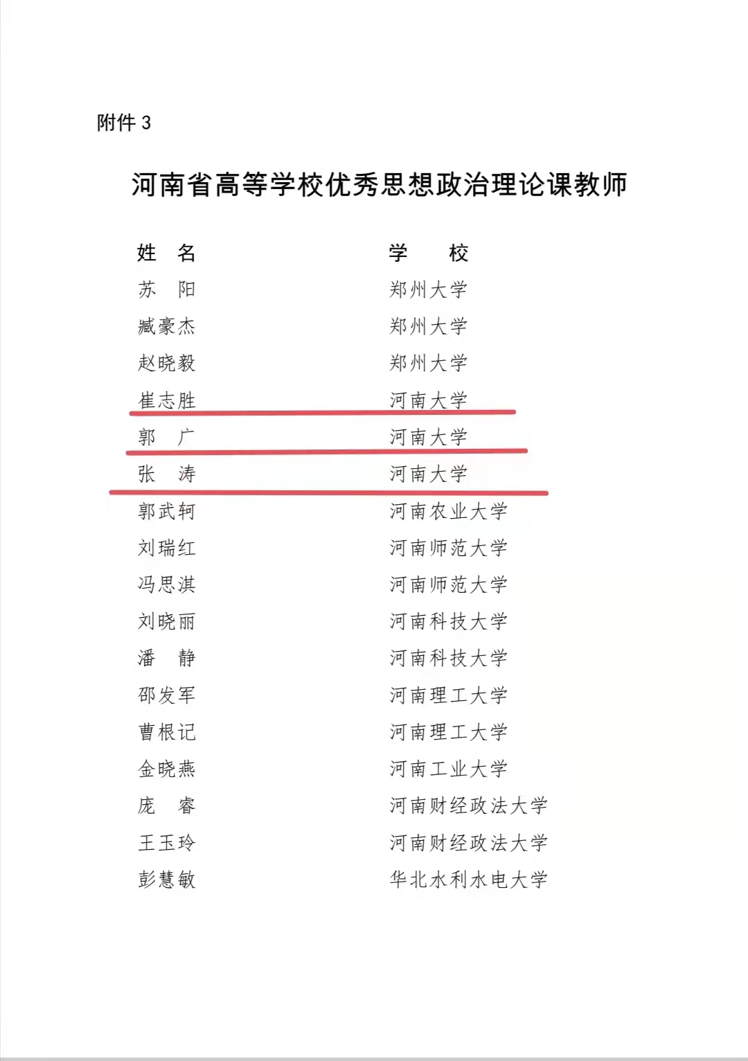 近日,中共河南省委教育工委、河南省教育厅下发了《关于公布全省高校思想政治工作奖评审结果的通知》,必赢242net在评审中喜获佳绩。公司党委副书记吴涛获评“河南省高等学校思想政治工作先进个人”,学院教师崔志胜、郭广、张涛获评“河南省高等学校优秀思想政治理论课教师”。