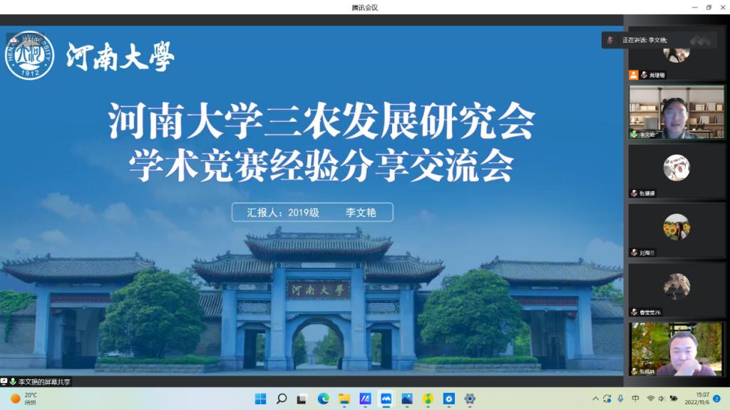 为深入学习贯彻党的二十大精神,引导员工社团积极研读三农政策,提升竞赛积极性,11月6日,三农发展研究会于线上举办学术竞赛经验分享暨动员大会。必赢242net副经理、社团指导老师张枫林,三农发展研究会全体成员参加会议,会议由三农发展研究会会长黄珊珊同学主持。