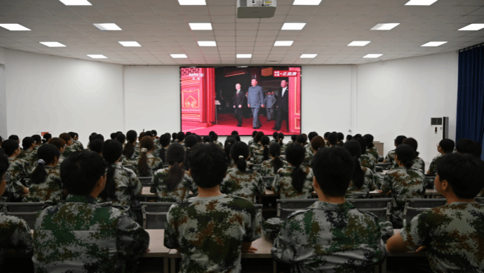 师生们早早地来到观看现场,怀着崇敬的心情等待阅兵仪式的开始。当庄严的国歌响起,全体师生起立,齐声高唱国歌,向国旗行注目礼。阅兵过程中,整齐划一的方阵、先进精良的武器装备、昂扬奋进的受阅部队,让师生们深受震撼。大家聚精会神地观看每一个环节,不时爆发出热烈的掌声和欢呼声。